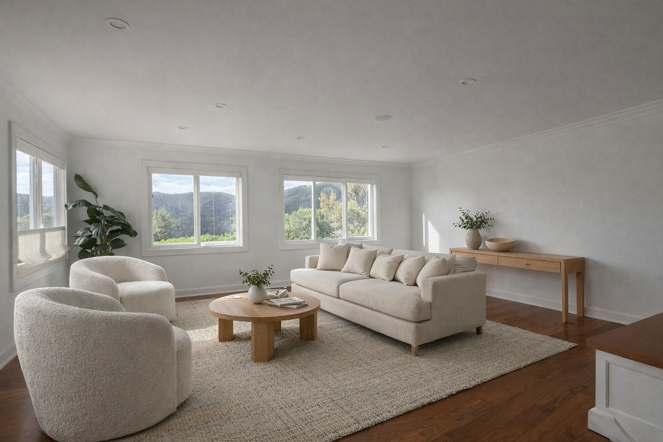 Inside, you’ll find four bedrooms, three and a half bathrooms, and an additional loft/den—plus multiple spaces to gather and unwind, including a dedicated dining room, a cozy TV room, and a separate seating lounge for conversation, reading, or quiet mornings. The interiors lean contemporary + organic—warm neutrals, natural textures, and clean lines—so the home feels calm, elevated, and effortlessly livable.